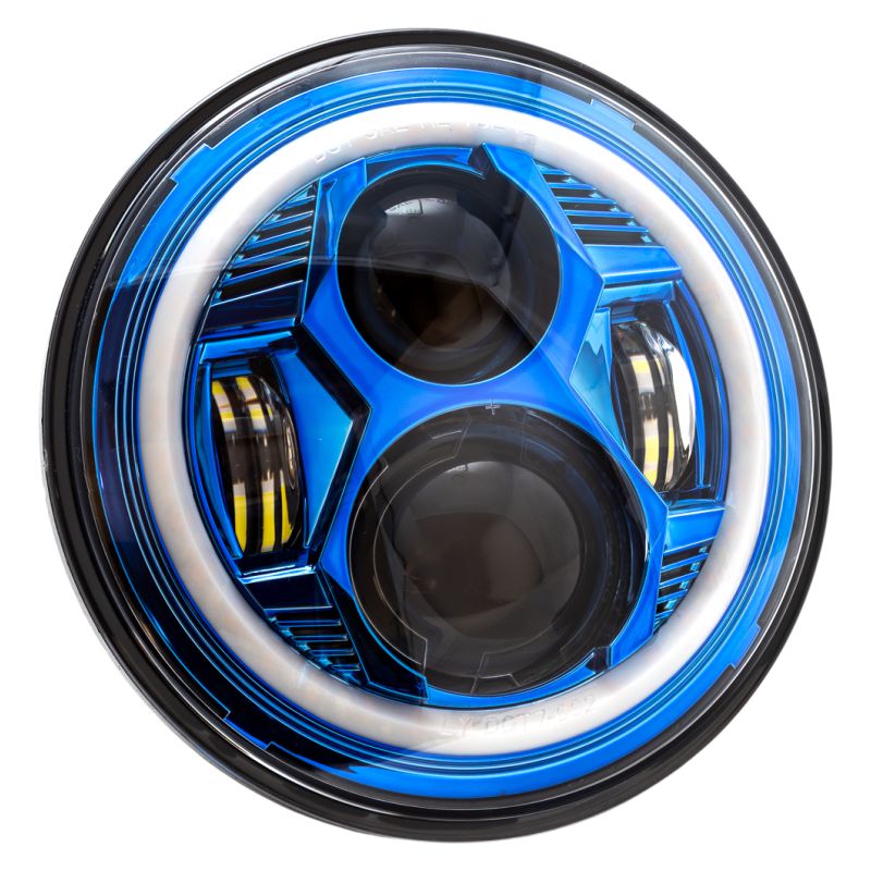 7″ Blue Color Collection wide-array (cool white) LED HeadlAMP® with Full Halo and adapter ring, 100% Plug-n-Play, includes wiring adapter! Fits all 2014-Up except Scout and FTR Models.