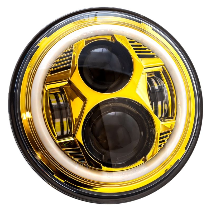 7″ Gold Color Collection wide-array (cool white) LED HeadlAMP® with Full Halo and adapter ring, 100% Plug-n-Play, includes wiring adapter! Fits all 2014-Up except Scout and FTR Models.